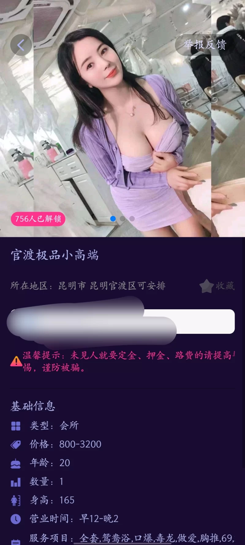 信息分类:楼凤兼职 地区:云南省-昆明 信息来源:亲自验证 年龄:25-29 颜值身材:95 服务项目:基本有的都有很不错 价格:800-3200 环境设备:小公寓很安全 详细地址:本段信息已隐藏,请先登陆。点击登陆 , 或者 点击注册 联系方式(QQ号):本段信息已隐藏,请先登陆。点击登陆 , 或者 点击注册 详细介绍: 身材很好碧水多可以体验这两天过年吃点好的加QQ叫瑶瑶别加错了 楼凤兼职